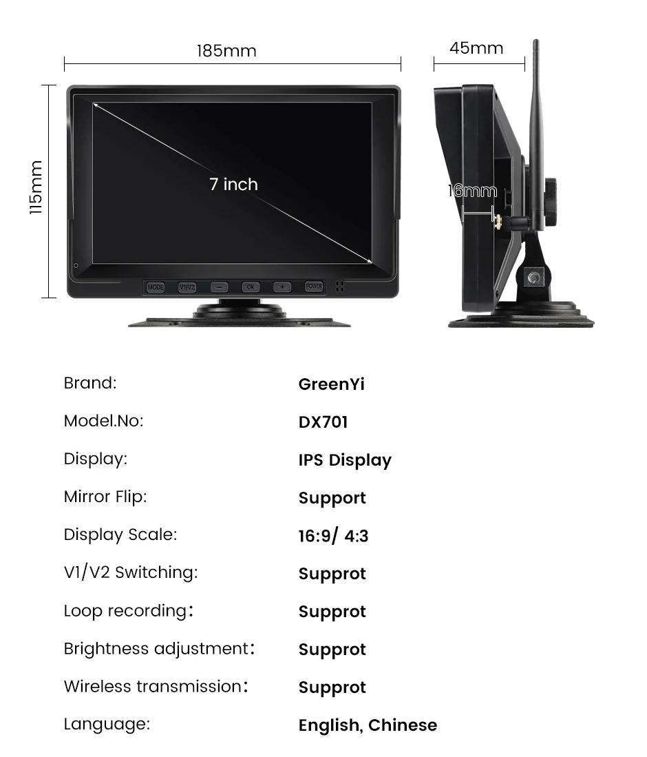 7'' Wireless IPS Vehicle Monitor | Truck Bus 720P Car Rear View Camera Kit | Digital Signal GreenYi
