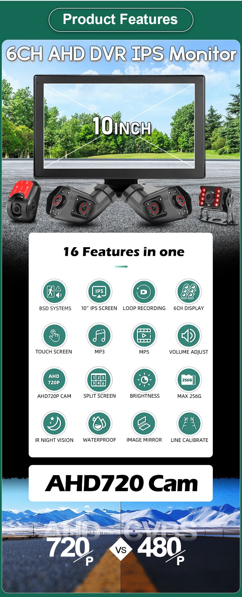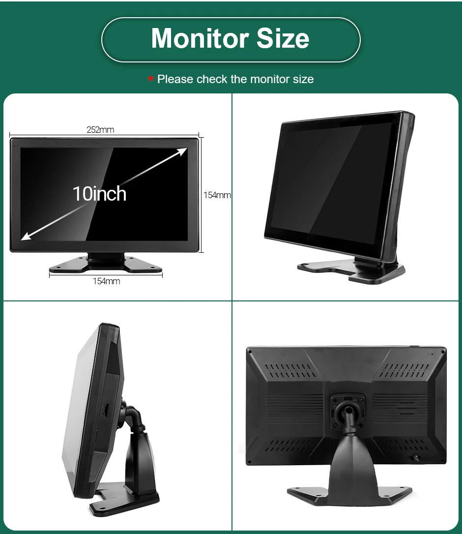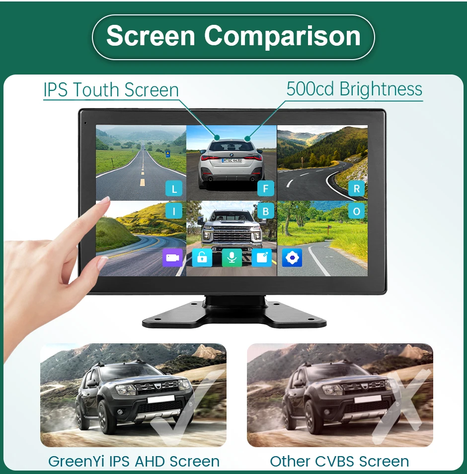 * 10.1 inch IPS touch screen. HD 500CD/M2, AHD 1280x720P video input. 6-channel screen split screen display.