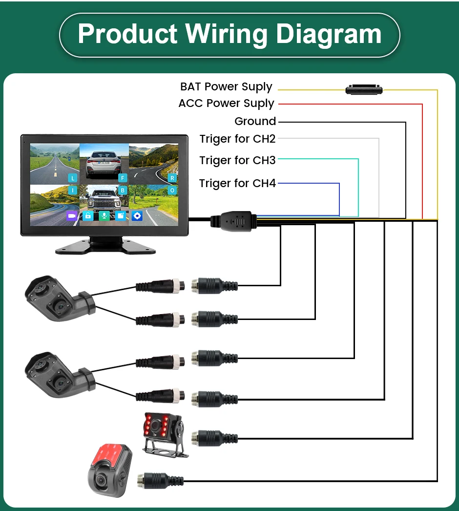 * Install four AHD cameras on the front, left, right, middle and rear side of the vehicle, respectively connected to the monitor. You will enjoy real-time driving monitoring, AI recognition reminders, driving assistance, parking monitoring, and driving records anytime, anywhere