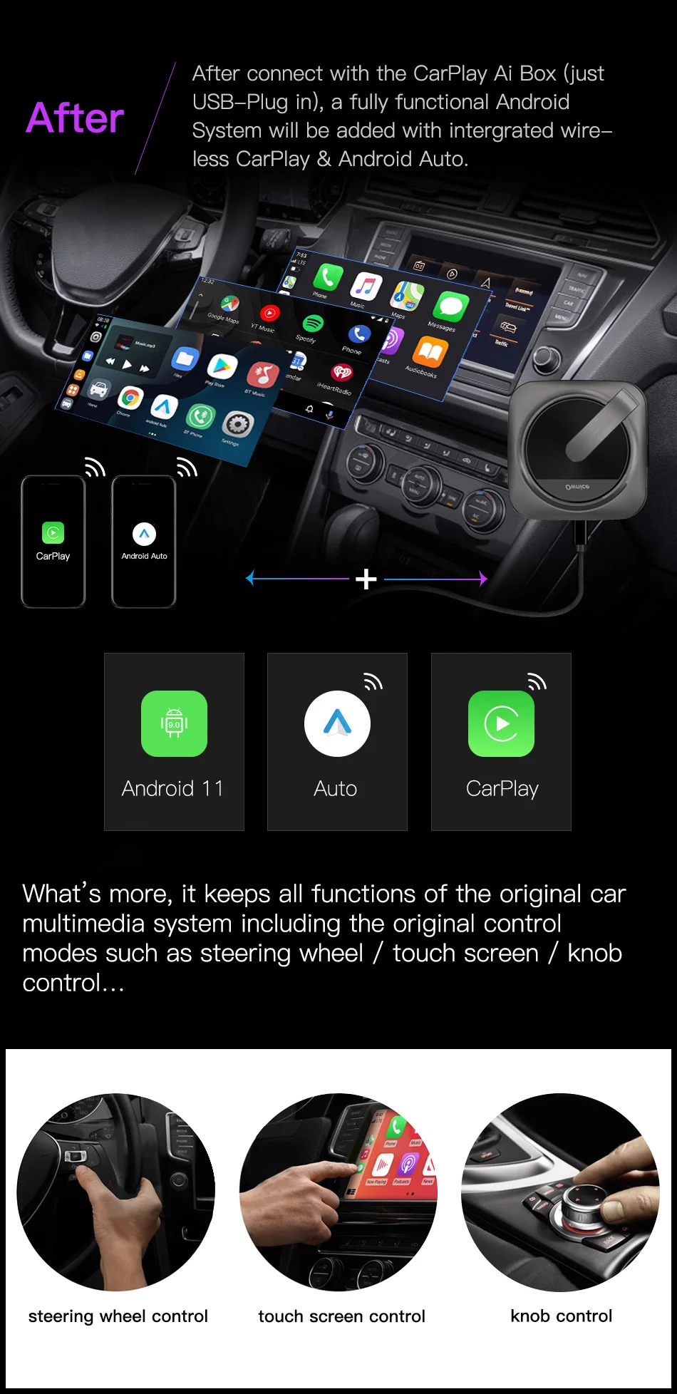 CarPlay Adapter - Wireless Android Auto Streaming Box for YouTube, Netflix, Spotify Ownice A0