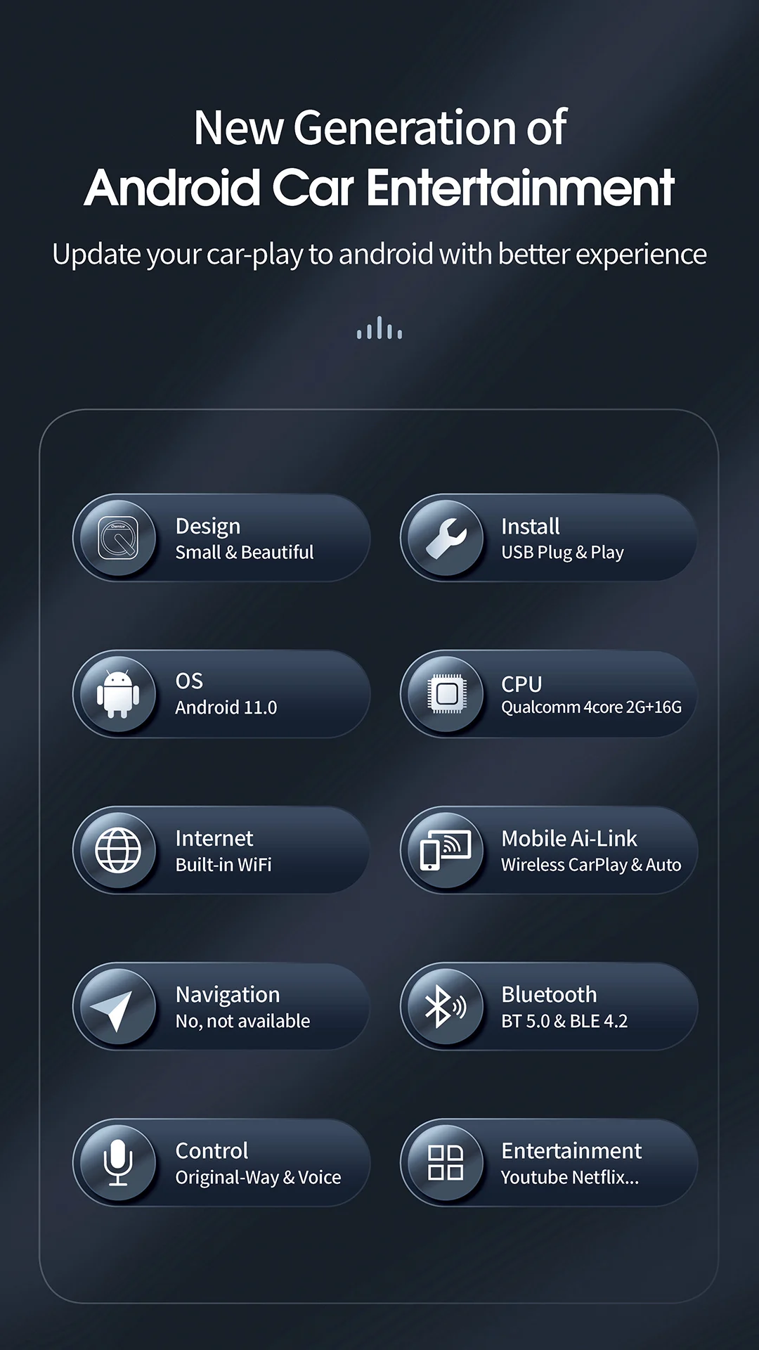 Upgrade your car multimedia system with the Ownice A0 CarPlay Adapter, an Android 11-based device that seamlessly connects your iPhone to your car's display via wireless CarPlay. Enjoy your favorite streaming services like YouTube, Netflix, and Spotify, all from the comfort of your car's dashboard. The Ownice A0 is easy to install and works with most car models. Get yours now for a more connected driving experience.