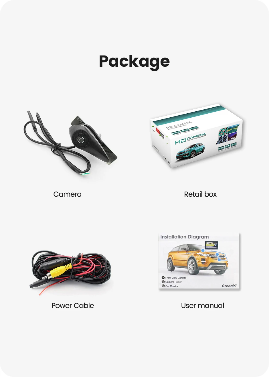 1. Front view camera 2. Retail box 3. Power cable 4. User manual
