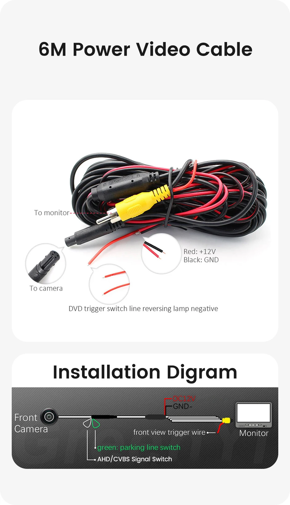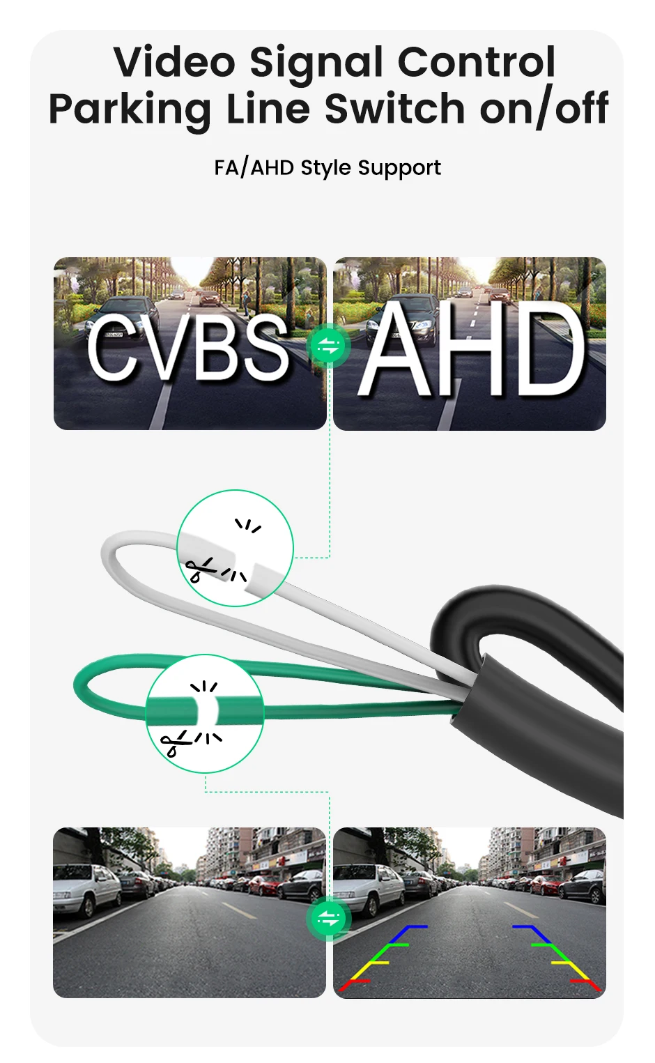 Font camera Show parking line ( Cut the green line to cancel the parking line ) AHD720P Video Signal ( Cut the white line and switch to CVBS signal ) Tips: AHD signal only supports AHD monitor; If your monitor does not support AHD, you can cut off the white line and the camera will switch to a common CVBS signal.