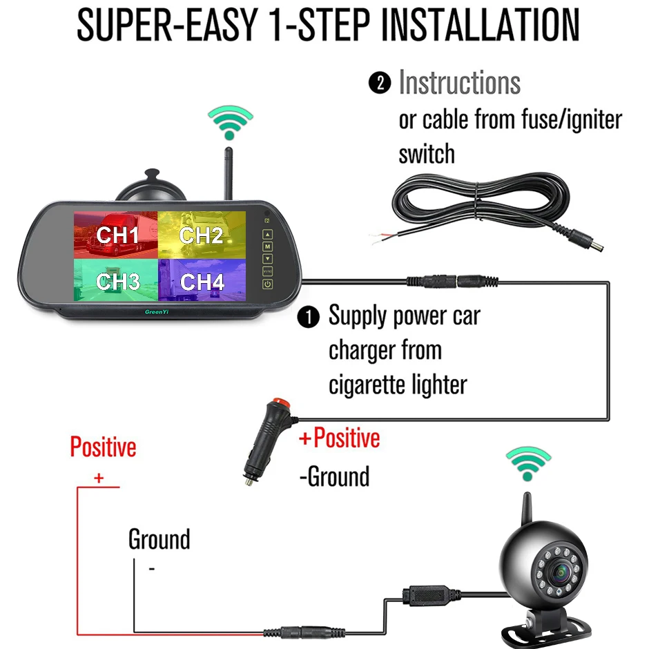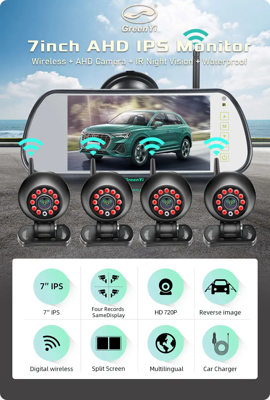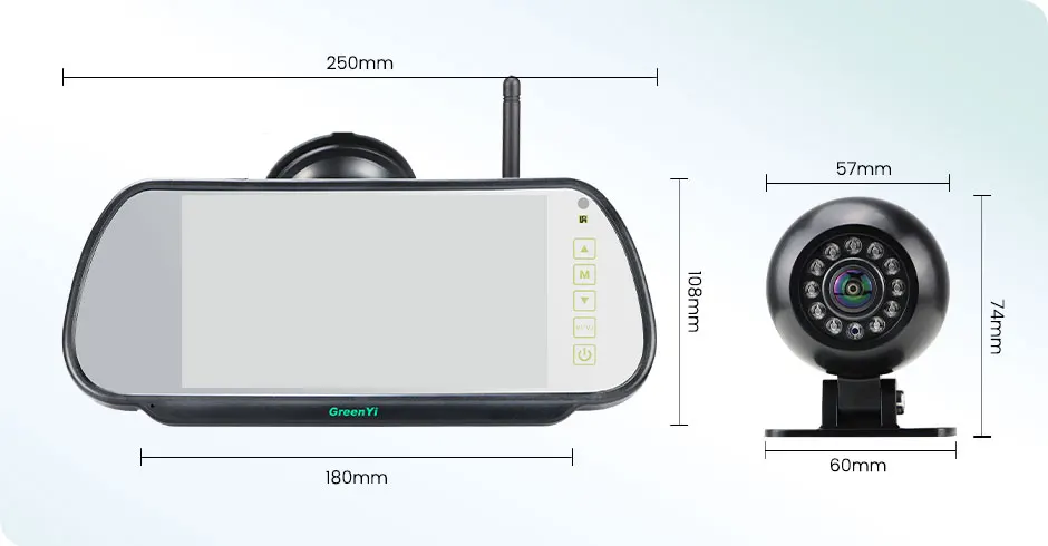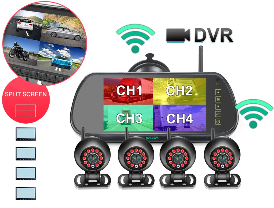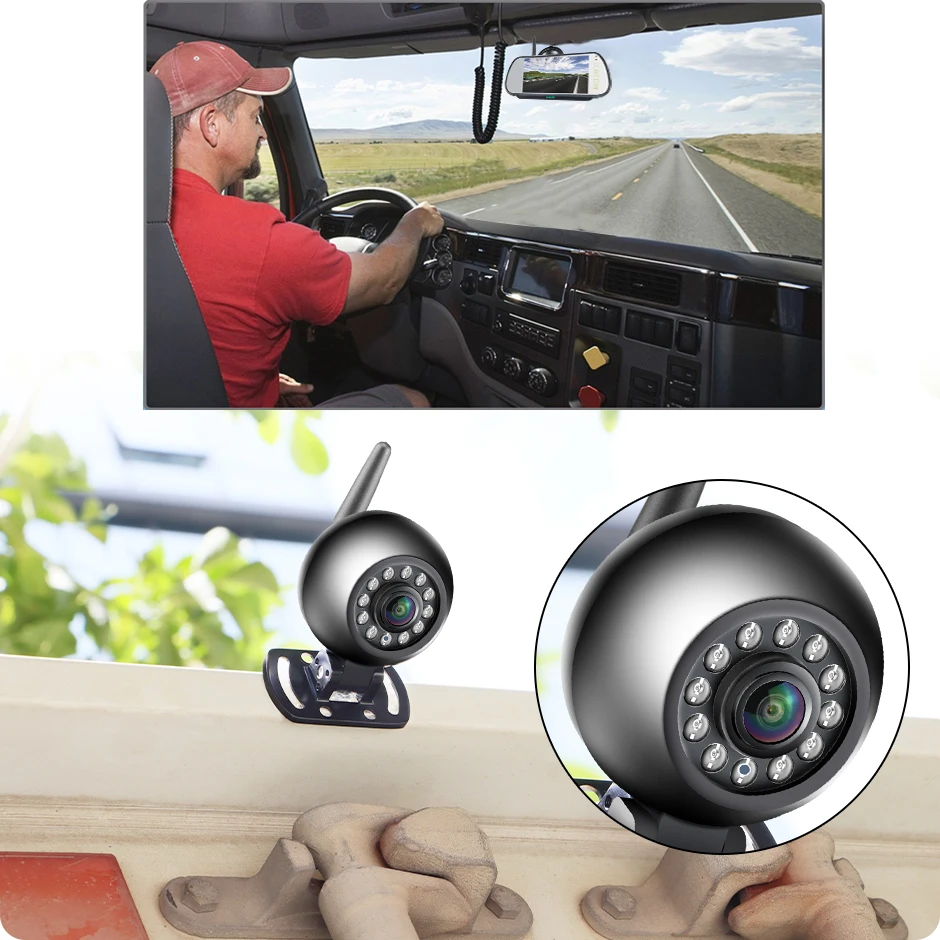 Drive with confidence using GreenYi's AHD Wireless 7'' DVR Mirror Monitor with IPS Screen. The round-shaped waterproof camera features IR night vision, ideal for buses, trucks, and motorhomes. Experience clear visibility day and night on your journeys.